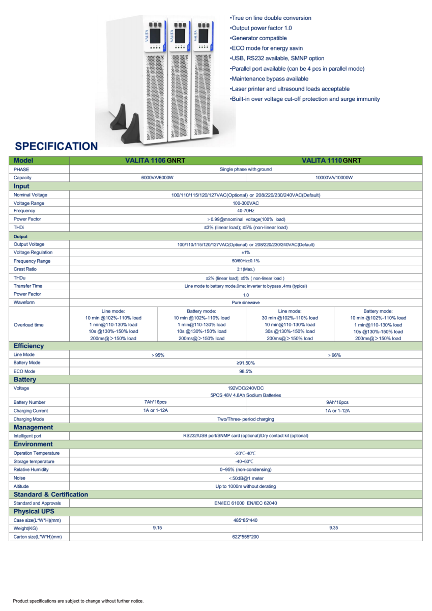 Bạn đang tìm kiếm một giải pháp lưu điện mạnh mẽ, bền bỉ và an toàn? Bộ lưu điện VALITA 1kVA-10kVA chính là lựa chọn hoàn hảo dành cho bạn. Được trang bị công nghệ tiên tiến, đặc biệt là ắc quy Sodium-ion (Na+), sản phẩm này mang đến hiệu suất vượt trội, giúp bảo vệ thiết bị điện trong mọi tình huống.